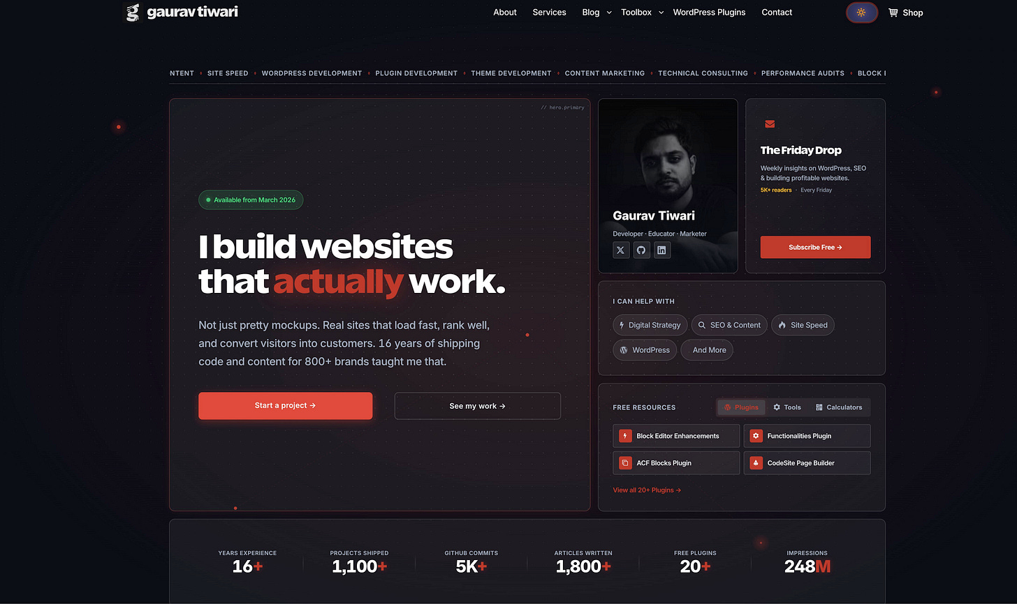 gauravtiwari.org now has a reworked homepage that actually shows what I do instead of just being a blog feed. You’ll see my services, open-source plugins, tools, calculators, more that I have been working on.